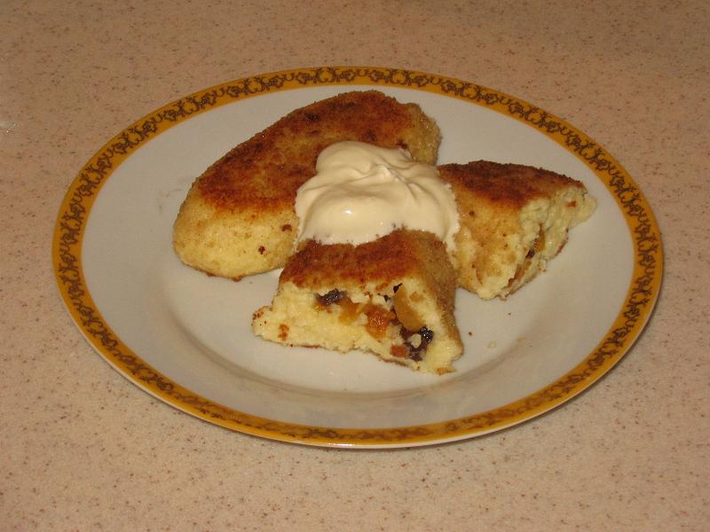 Нужно: 130 г пшена, 550 мл молока, 1 яйцо, 10-12 ягод кураги, горсть изюма, 1 ч.л. меда, соль и сахар по вкусу, растительное масло для обжаривания, панировочные сухари.