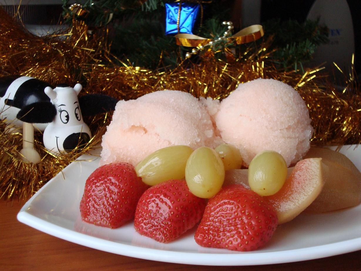 Груши очистить от кожуры, не разрезая, виноград снять с веточек. В огнеупорную кастрюлю влить вино, положить сахар, сок и цедру лимона, ванильный сахар, разломанную палочку корицы, гвоздику. Довести до кипения, положить груши, переставить в разогретую до 170 градусов духовку, готовить 30-40 мин. Добавить виноград, готовить еще 5 минут, остудить. Клубнику разрезать вдоль пополам; груши вынуть, разрезать на четвертинки, положить груши и клубнику в кастрюлю. Поставить в холодильник на 6-8 ч. Затем шумовкой вынуть фрукты и пряности из сиропа, пряности удалить. Фрукты сбрызнуть коньяком, плотно закрыть пленкой, поставить в холодильник. Сироп влить в широкую посуду и заморозить, 3-5 часов, трижды перемешав за это время. Подать сорбет вместе с фруктами.