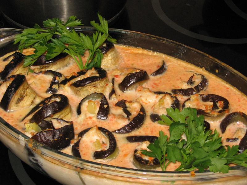 1.Бакалжаны разрезать вдоль на тонкие ломтики, пробланшировать в подсоленой воде, либо обжарить с двух сторон на раст.масле.