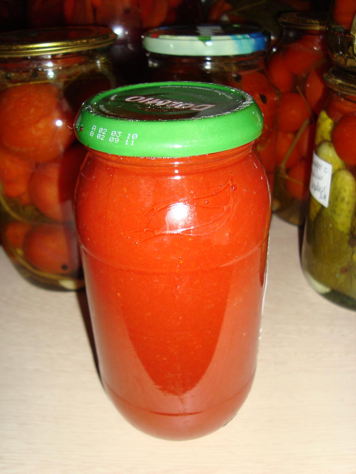 Помидоры нарезать дольками и вместе с луком распарить под крышкой. Протереть через сито. Полученный сок уварить наполовину. Пряности положить в мешочек из марли и опустить в кипящую массу. Добавить соль, сахар, уксус и варить еще 5-7 минут. После чего пряности вынуть, а готовый кетчуп разлить в бутылки и закупорить.