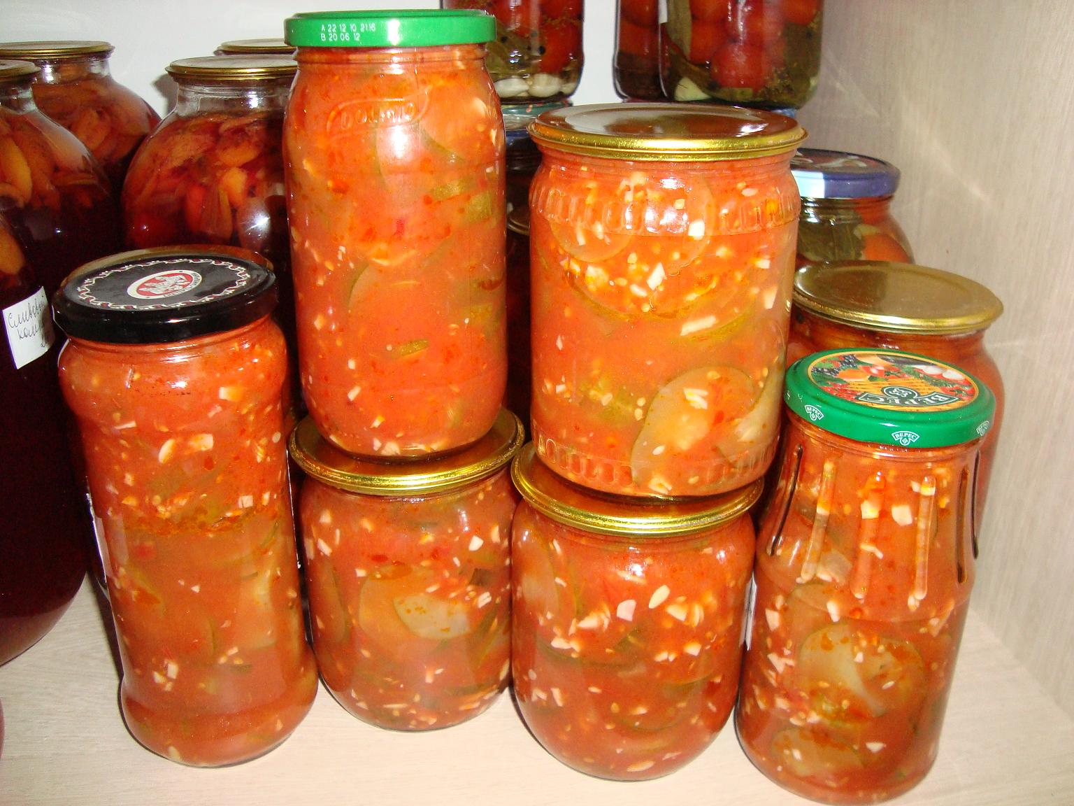 Помидоры пропустить через мясорубку, добавить растительное масло, сахарныйпесок, соль, довести до кипения и варить 10 минут. Потом постепенно добавитьразрезанные на колечки огурцы .После закипания варить 20 минут, потом добавить чеснок и уксус', все перемешатьи разложить в стерилизованные банки, укупорить.
