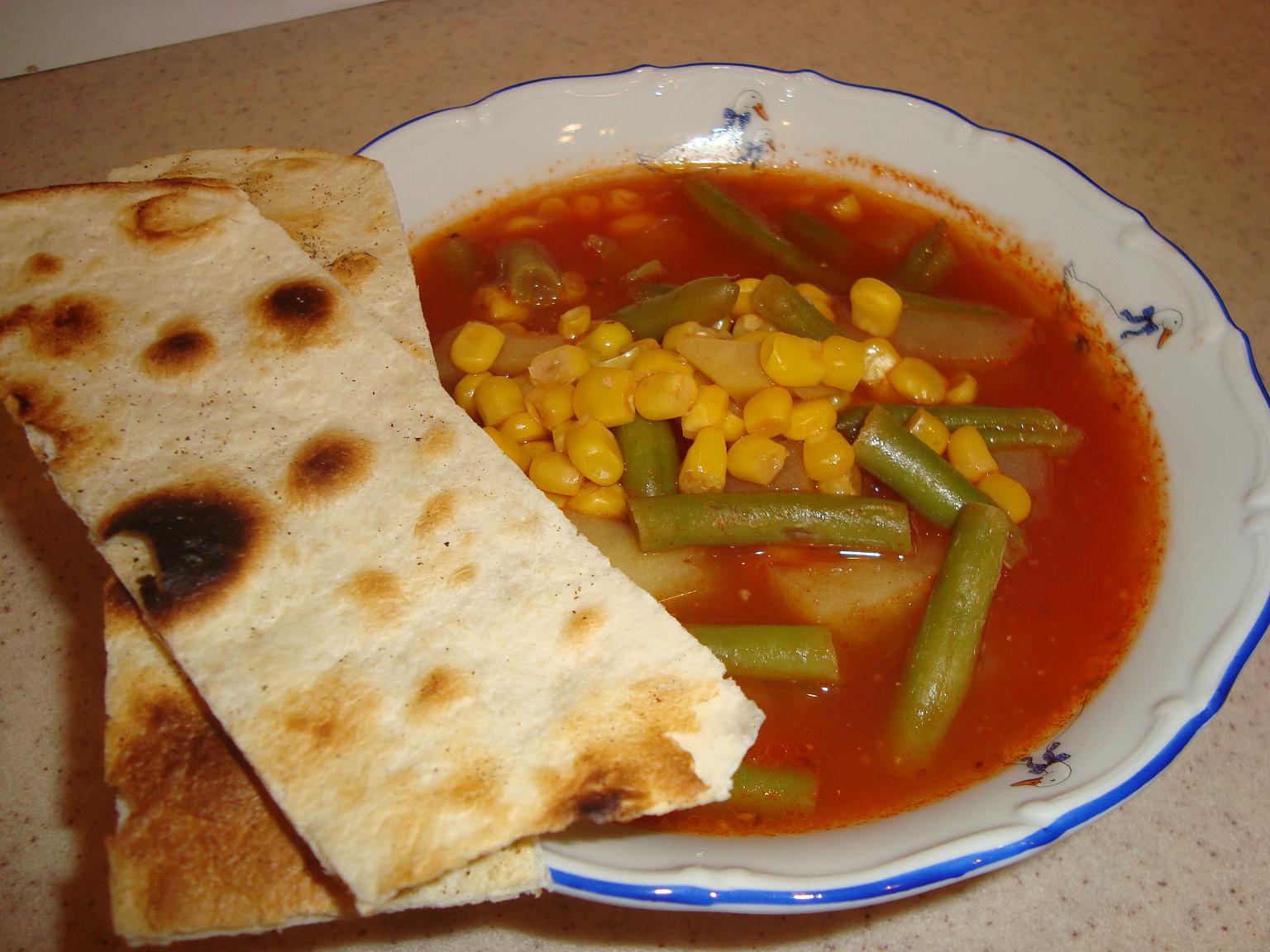 Положить фасоль и кукурузу. Накрыть крышкой, варить еще 5 минут. Перед подачей на стол добавить кусочки тортильи.