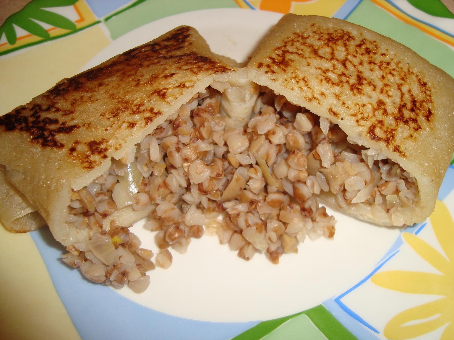 На каждый блин положить по 1,5 - 2 ст. л. начинки. Свернуть блины конвертиками.