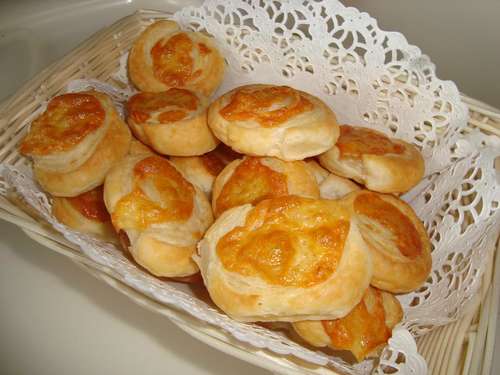 Тесто раскатать в пласт в одном направлении, посыпать натертым на крупной терке сыром. Свернуть рулетом и нарезать на кусочки толщиной 1-1,5см, выложить на противень, застеленный бумагой на срез. Запекать при 220 градусах до золотистого цвета.